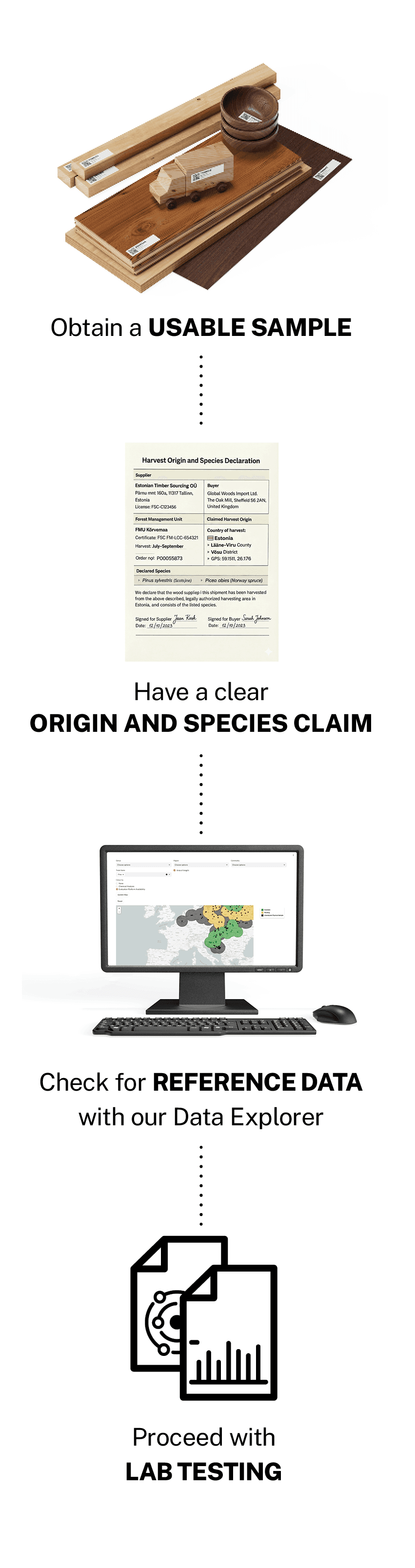 Scientific origin testing can verify whether a product's declared harvest origin is correct using the chemical signatures in wood compared against verified reference data. Before commissioning any testing, there are three things to confirm.